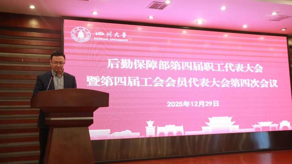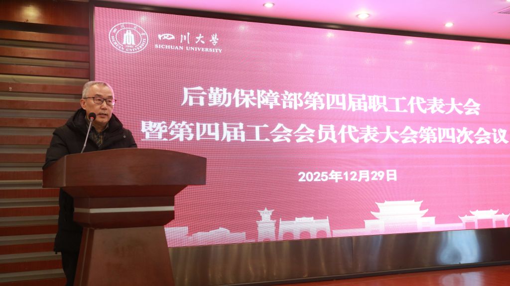 后勤保障部党委书记韩杰致开幕词。他指出,本次“双代会”召开于“十四五”收官、“十五五”谋划的关键阶段,正值学校全力推进高质量发展、加快建设中国特色世界一流大学的重要时期,意义尤为重大,全体代表应以高度的政治责任感和历史使命感,紧紧围绕会议主题,认真听取并审议《后勤保障部工作报告》等会议文件,聚焦后勤“十五五”规划讨论稿与当前重点工作,畅所欲言、集思广益,汇聚实践智慧、提出改革良策,真正实现共商发展大计、共绘改革新篇的目标,共同开创四川大学后勤事业发展的新局面,为学校全面推进中国特色世界一流大学建设作出新的更大贡献。