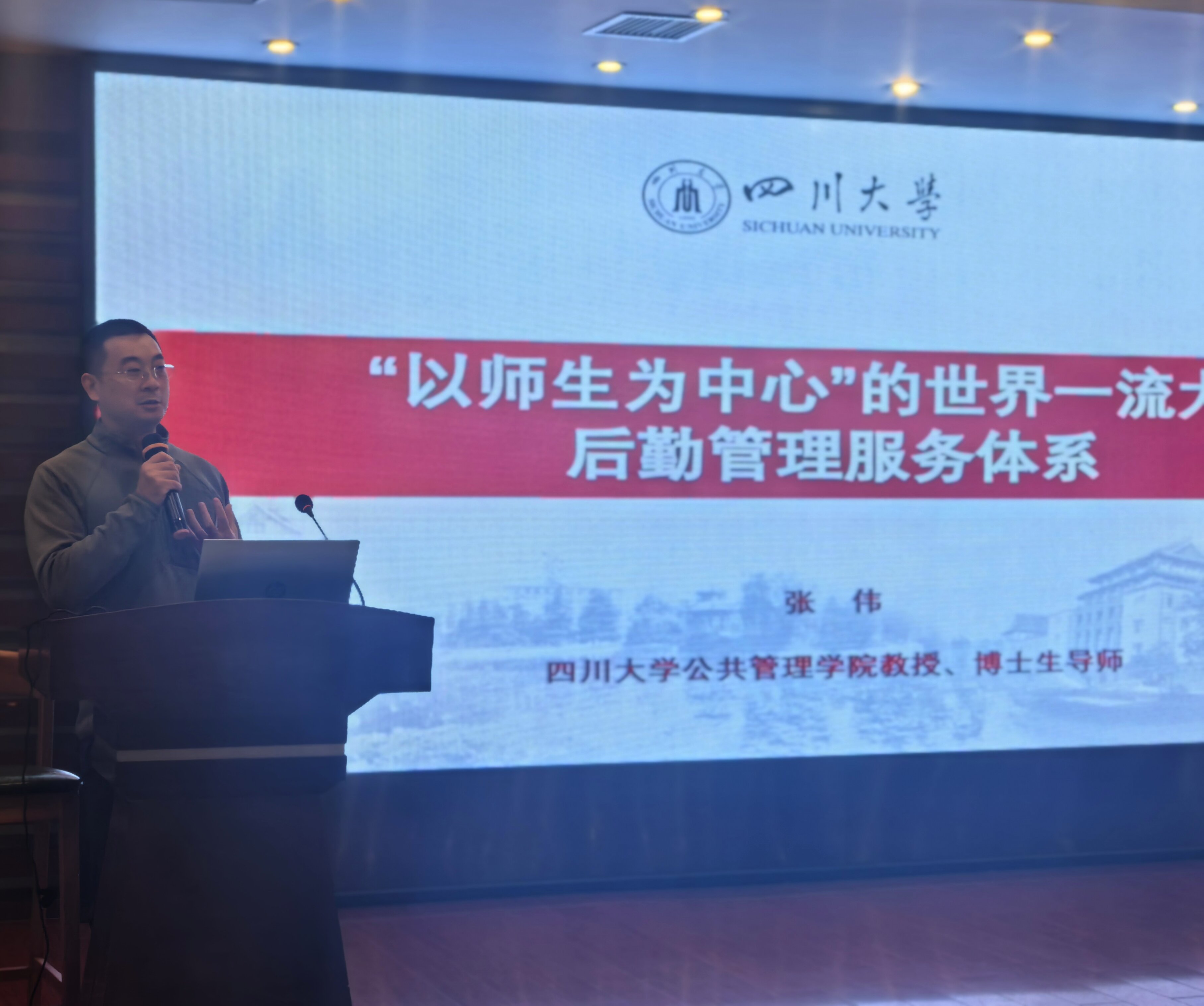第二场,四川大学公共管理学院张伟教授以“‘以师生为中心’的世界一流大学后勤管理服务体系”为主题,系统阐释后勤服务作为大学核心竞争力关键组成部分的重要意义,强调应以师生的需求、体验、反馈和价值创造为起点与核心,通过精准服务、精细管理、智慧治理和持续改善,构建安全、便捷、健康、高效、温暖的校园环境。讲座结合国际知名高校管理经验,深入解析了“需求导向、体验驱动、全生命周期管理、价值共创”的核心内涵。张伟教授指出,后勤应着力推进服务流程优化、数字治理赋能、师生参与共治和队伍专业化建设,构建“制度化、平台化、协同化”的现代化后勤治理体系。讲座内容紧密对接学校“双一流”建设目标任务和后勤工作实际,与会同志深受启发。