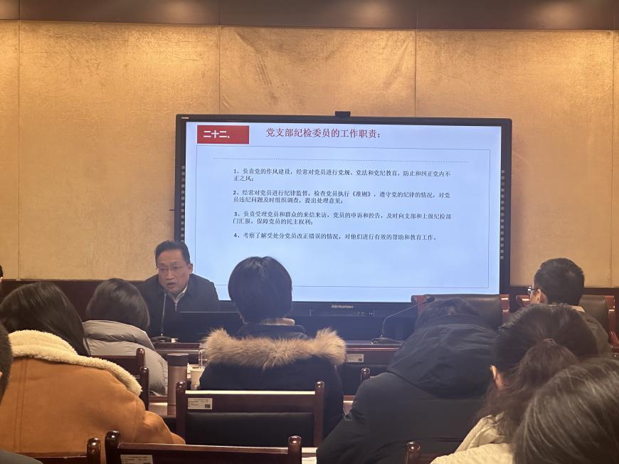 韩杰围绕《中国共产党支部工作条例(试行)》展开培训,结合后勤工作实际,从党支部工作原则、职责定位、组织设置、组织生活等方面与大家进行了交流。聚焦党支部纪检委员工作职责和三项重点工作,要求党支部纪检委员每年至少组织一次党纪专题学习、开展一次廉洁风险排查、进行一次警示教育、与重点岗位人员至少进行一次谈心谈话、向支部大会报告一次纪检工作,确保纪检工作落到实处,取得实效。