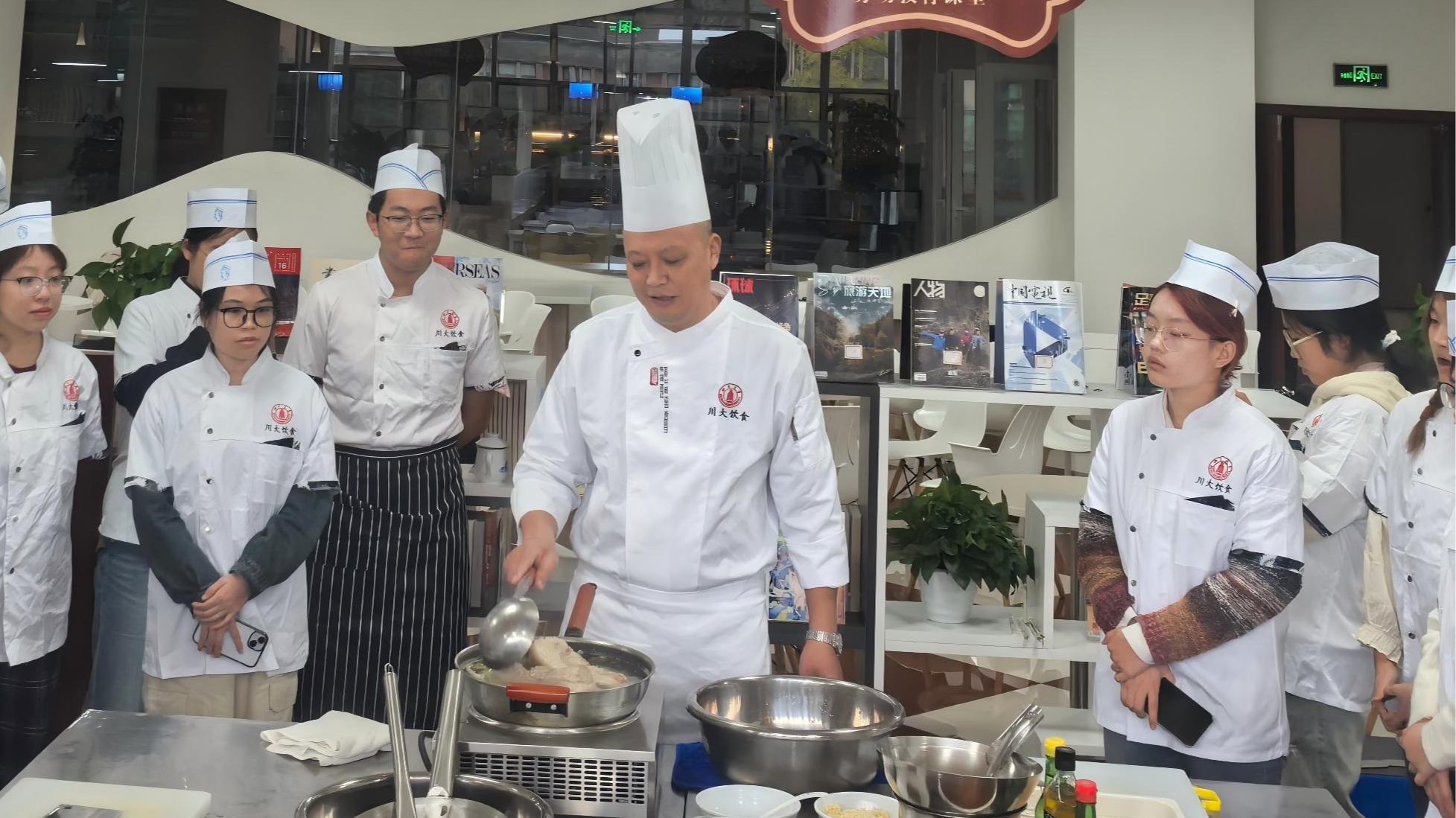 此外,中心特邀国家级注册烹饪大师包奕燕教授开展“名厨进校”活动,通过“文化讲座+现场烹饪+菜品展示+美食品鉴”的多元形式,为25名学生代表和5名教职工代表带来专业指导。名厨团队现场烹制的4道川菜代表作还在专属窗口供应,让近2000名师生品尝到专业水准的美食,近距离感受烹饪艺术的魅力。
