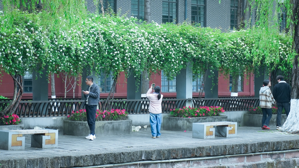 这便是春日校园赠予师生的一场盛大而又温柔的相遇。不必刻意寻芳,只需从廊下走过,便能与满架的花瀑、淡淡的清香撞个满怀。年年花如期,人总相逢,这一帘白色花海,便成了校园里最浪漫的注脚,也成了无数川大人关于春天最深切的记忆。