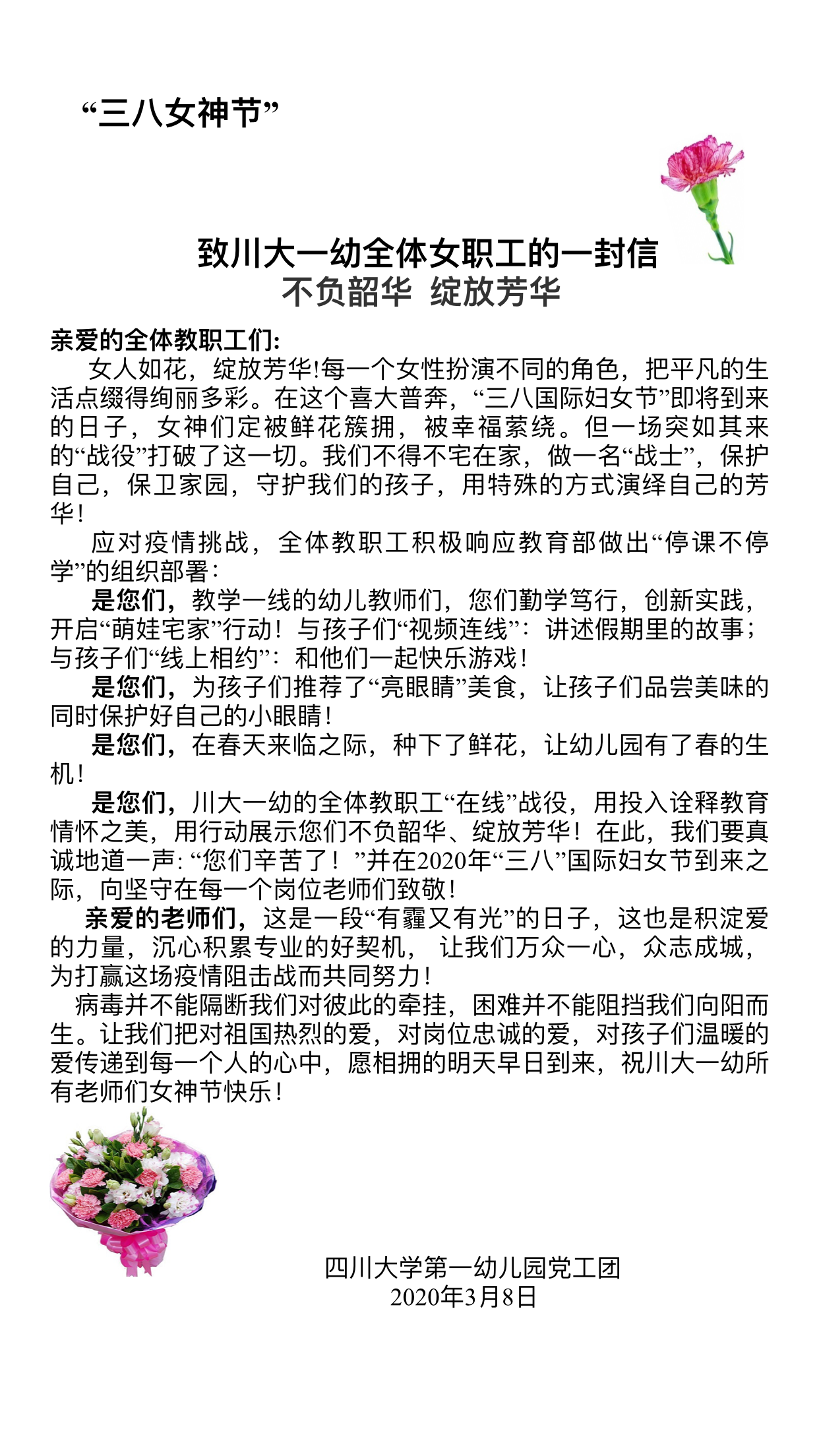 美丽三月已如期而至,春分微微倾城,三八妇女节的温暖气息伴随着和煦的阳光扑面而来。疫情还未解除,口罩还未取下,我们隔离病毒,但不隔离爱,在这个特殊时期的女性节日里,川大一幼用特别的方式来庆祝全园女教师们的节日——“三八”国际妇女节。