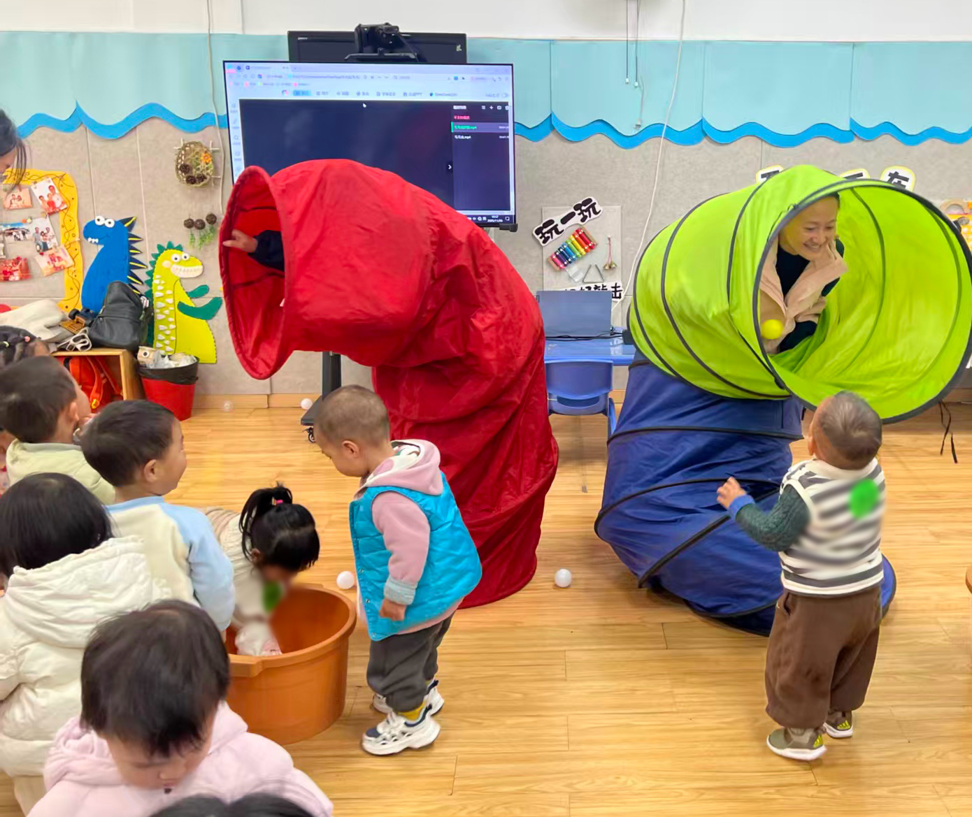 活动伊始,老师在教室门口亲切地迎接萌宝们,用温暖的笑容消除孩子们的陌生感。在森林主题的早操环节中,轻快的音乐响起,萌宝们化身“跳跳小兔”,跟着老师左蹦右跳地“吃青草、拔萝卜”,在欢快的律动中释放活力。