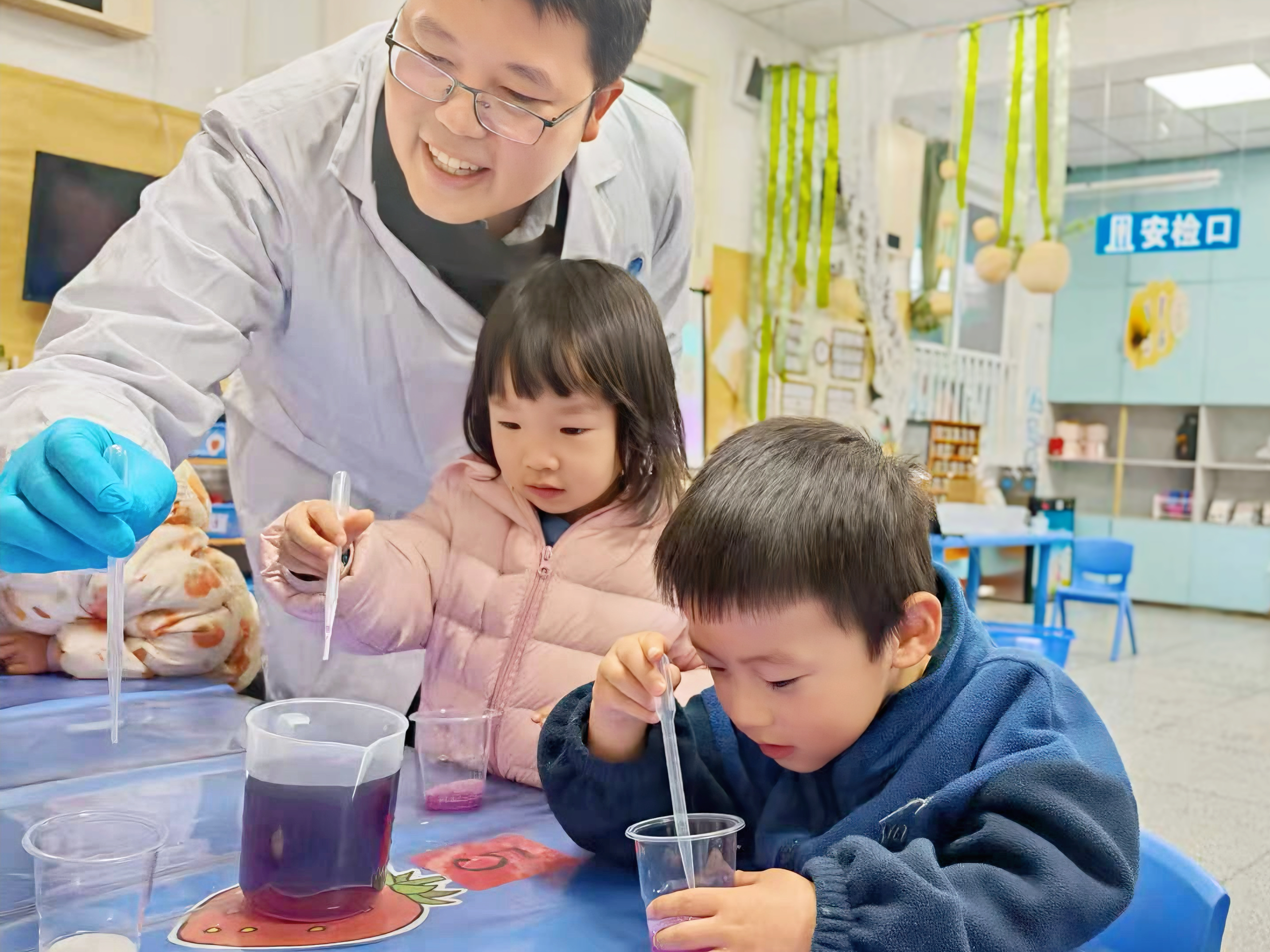 中二班嘉耀爸爸则带来《奇幻聚合物:“塑”造神奇,“胶”个朋友》科学实验课。他避开复杂公式和原理,通过趣味实验带领孩子们探索高分子材料的奥秘。白色粉末“吃掉”水分、紫外线灯照射使透明的高分子树脂胶凝固成小勋章和小花朵的神奇现象,引得孩子们阵阵欢呼。这场实验不仅让幼儿认识了高分子材料,更有效激发了他们的观察力与探索精神,更体验到了探索科学的乐趣。