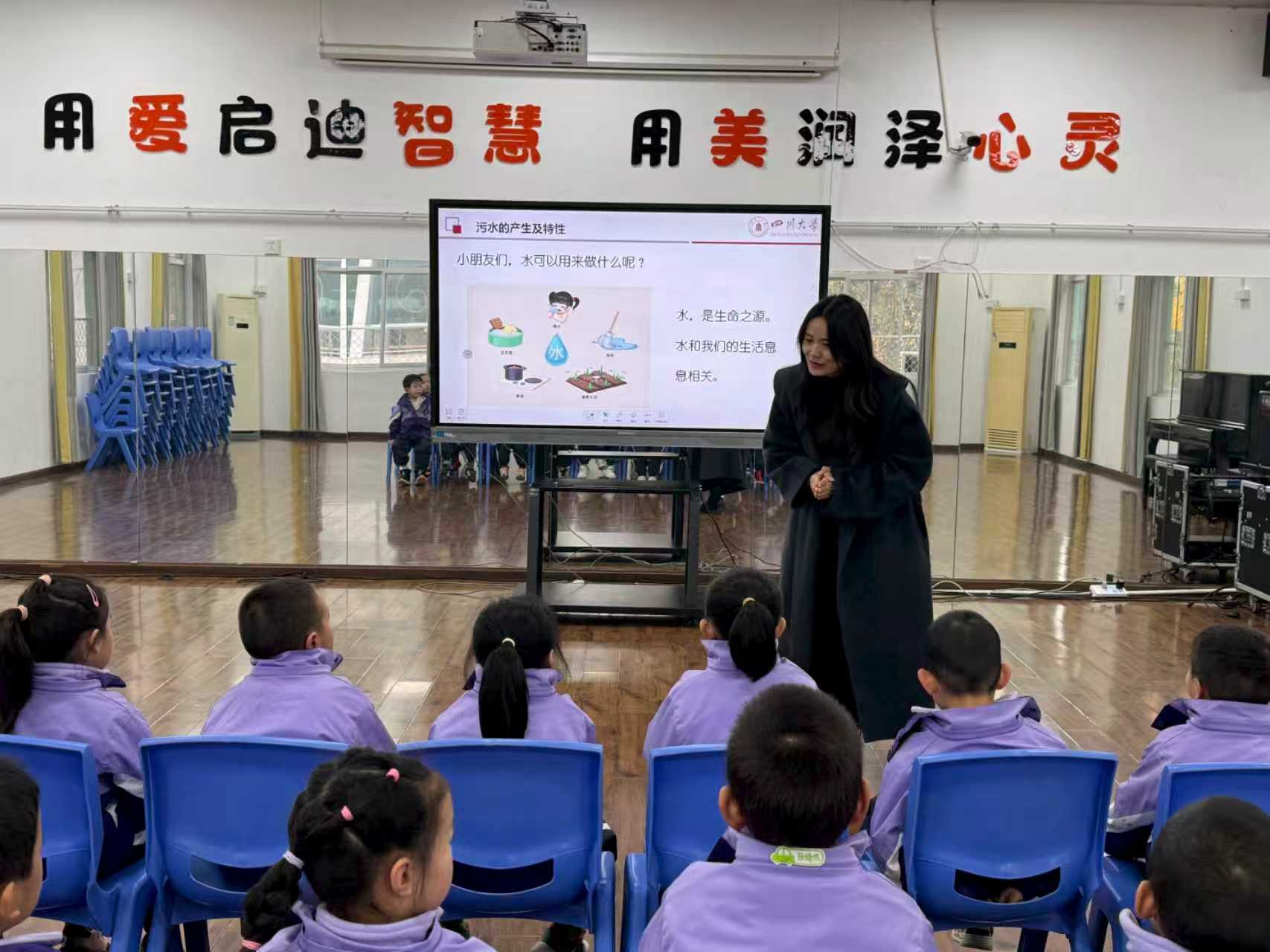 大二班可乐妈妈以《污水变清流,节水记心间》为题,用生动的语言和图片,向孩子们科普污水的来源与处理流程,耐心解答“污水怎么变干净”“处理后的水能养鱼吗”等疑问,用浅显易懂的方式讲解沉淀、过滤、消毒等工序。活动尾声,她还为班级赠送科普图书《污水中有哪些资源》,让节水爱水的种子在孩子们心中生根发芽,小小的环保卫士会用实际行动守护水资源,让节约用水成为日常习惯,将绿色理念融入生活点滴。