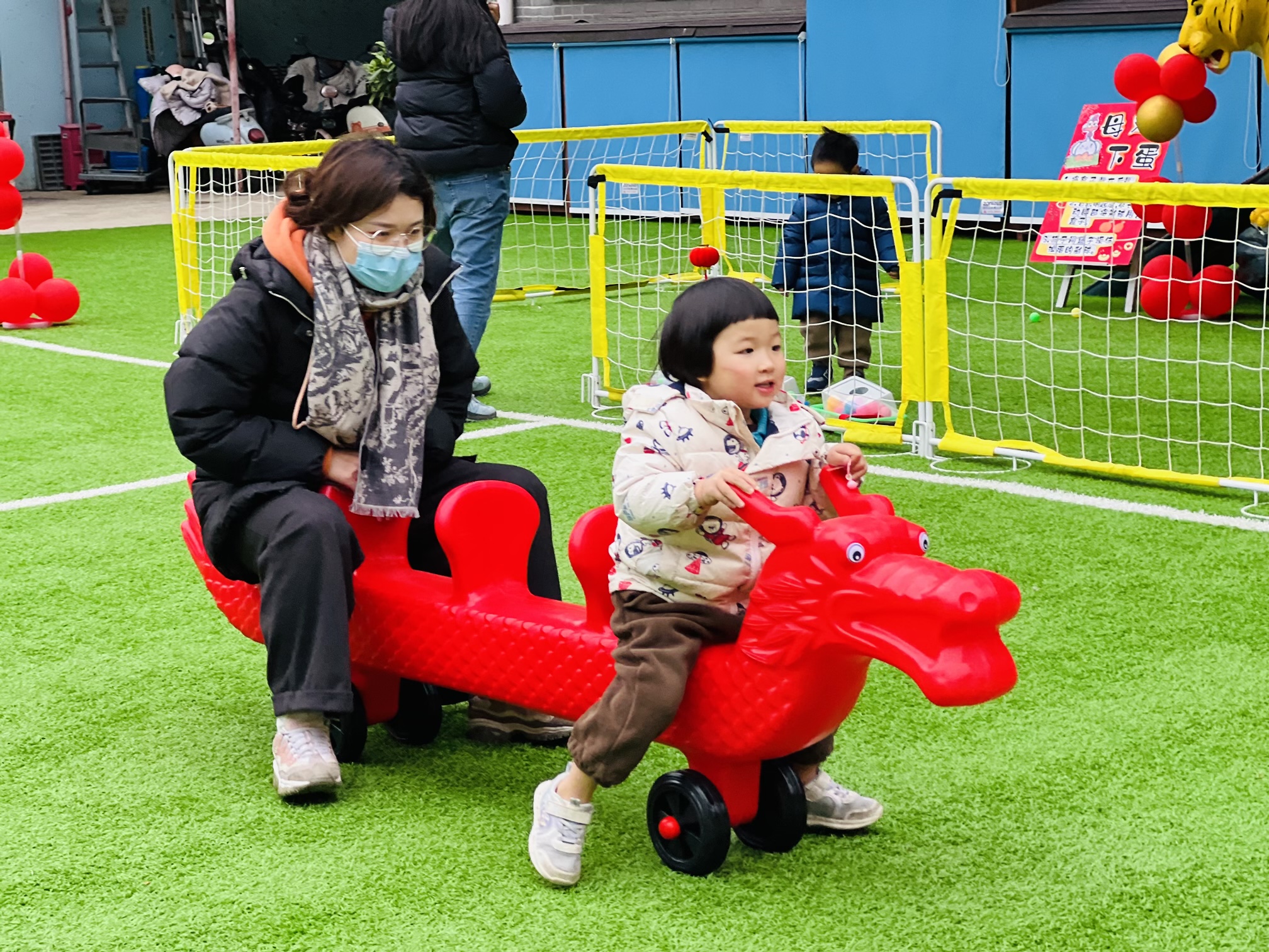 本次活动以马年文化为核心,精心设计两大特色板块,让不同年龄段幼儿都能沉浸式感受节日乐趣。中大班的传统艺术游园区内,剪纸展台前孩子们握着安全剪刀认真裁剪小马窗花,扎染工坊里蓝白布料在小手翻动下晕染出独特纹路,舞龙体验区则传来阵阵欢快的鼓点,身着喜庆服饰的小朋友们举着迷你龙身尽情舞动。