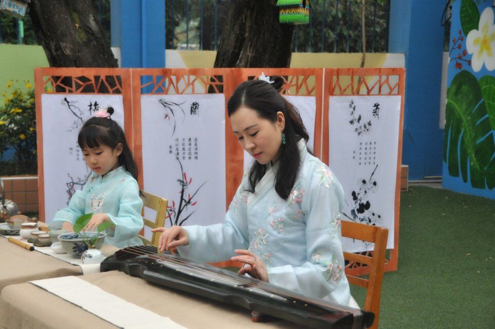 咦,我听见一阵阵悠扬的古琴声,走进一看,哇!一位漂亮的妈妈正在拨动着一根根琴弦。旁边可爱的小姐姐在干什么呢?爸爸告诉我,她在泡茶。南方谷雨有摘茶习俗,传说谷雨这天的茶喝了能清火明目。所以谷雨这天不管什么天气,人们都会去茶山摘一些新茶回来喝。在这里,小姐姐和美女老师们也请我们品尝了一杯雨前茶,那清新的茶芽,带着淡淡的纯香,让我们陶醉在春茶的清香中,也让我们对谷雨有了更加深入清晰的认识。